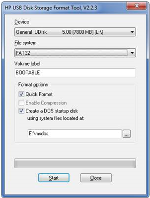 - Select “Quick format”, and “Create DOS startup disk using system files located at:”